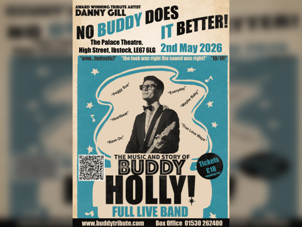 Danny Gill is Buddy Holly: No Buddy Does It Better! The music and story of Buddy Holly. With full live band & screen show, Danny takes you through the story of Buddy Holly like no other. With all the hits, the wit, the stories, the voice, the guitar and the glasses! From Peggy Sue to Heartbeat, From Maybe Baby to Not Fade Away! Sing along to classics Everyday and Raining in My Heart, reminisce to No1 Hits It Doesn't Matter Anymore and That'll be the day, dance to rock n roll classics Oh Boy! and Rave On! Feel the love with True Love Ways and It's so Easy! Buddy Holly Hits Ibstock Palace Community Centre. No Buddy Does It Better!