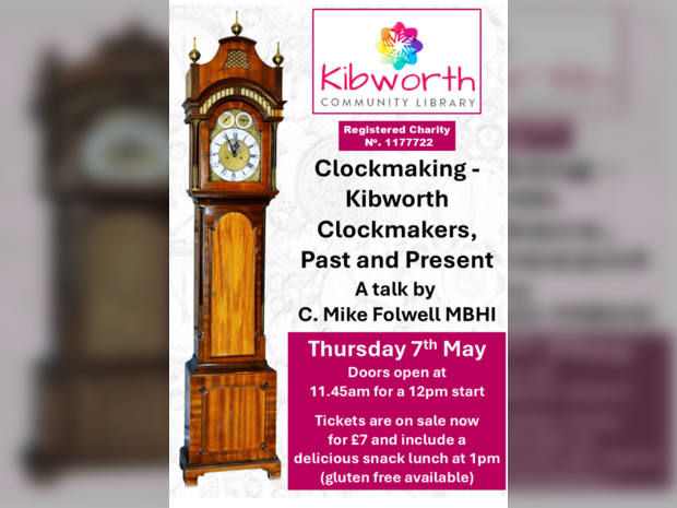 We are delighted to welcome C. Mike Folwell MBHI to the library on Thursday 7th May to give a talk entitled Clockmaking, Kibworth Clockmakers, Past and Present.