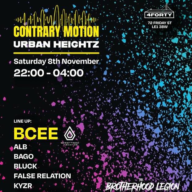 Contrary Motion teams up with Urban Heightz for a huge night of Drum & Bass and Jungle at Leicester's brand-new 440 venue. With Spearhead Records celebrating 20 years, we're bringing label boss BCee to headline a night of underground energy and heavyweight sets, powered by Funktion-One sound.