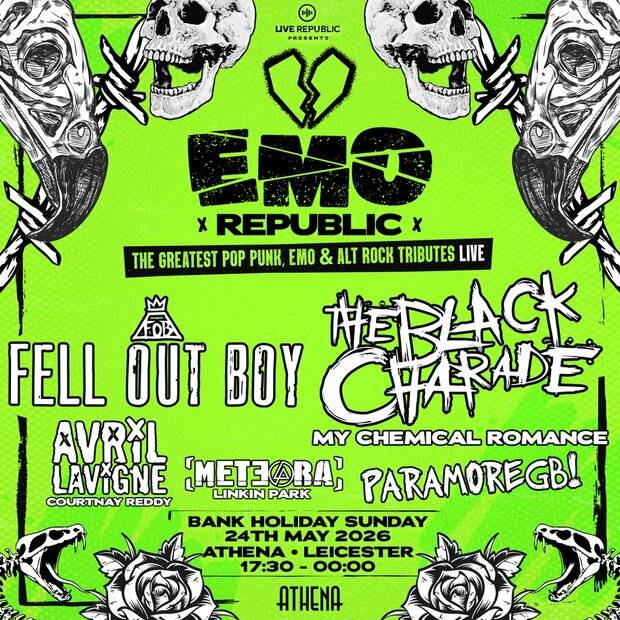 Get ready Leicester! Emo Republic lands at Athena on Sunday 24th May, bringing a full-scale tribute celebration of the biggest alternative and emo icons of the 2000s
