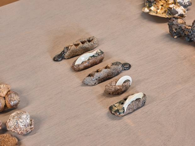 Root fires all the work in a self-built wood kiln at Lyde Green Pottery, Bristol—shared with over 100 artists from the UK and abroad. The kiln’s temperature, smoke, and atmosphere become collaborators, shaping each piece through unpredictability and alchemic transformation. Some of the works adapt ancient ceramic formulas used for amulets and beads in Egyptian and Islamic pottery—merging historic recipes with found materials and contemporary firing methods.